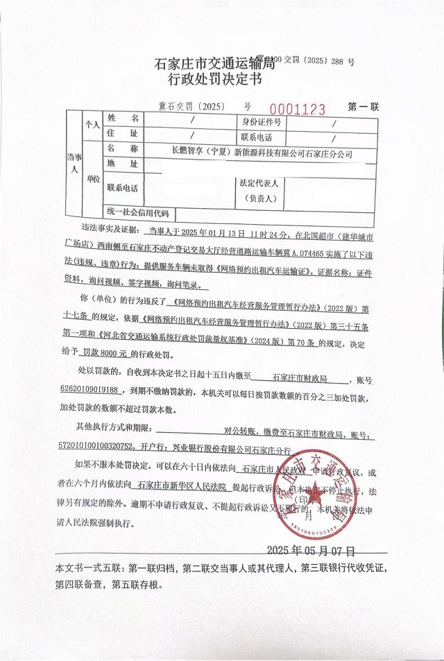 长燃智享(宁夏)新能源科技有限公司石家庄分公司冀A.D74465提供服务车辆未取得《网络预约出租汽车运输证》冀石交罚〔2025〕0001123 号