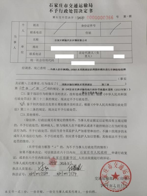 石家庄顺淼汽车运输有限公司的冀A.190AV道路运输经营者未按照规定的周期和频次进行车辆检验检测(冀石交不罚决字[2024]0000000366号)