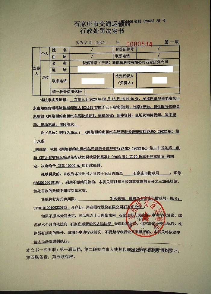 长燃智享(宁夏)新能源科技有限公司石家庄分公司提供服务驾驶员(冀A.DC4241)未取得《网络预约出租汽车驾驶员证》(冀石交罚〔2025〕0000534 号)