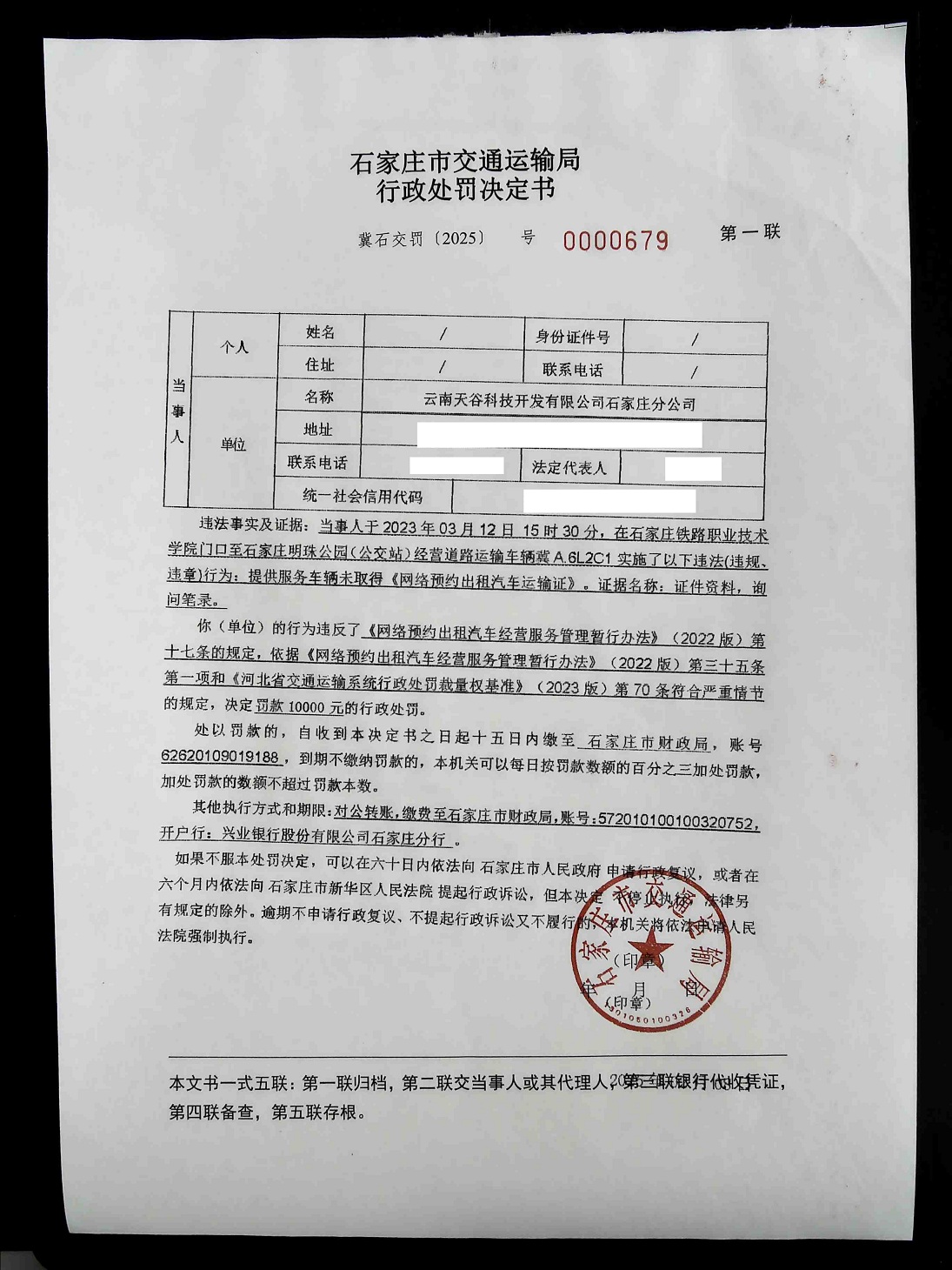 云南天谷科技开发有限公司石家庄分公司冀A.6L2C1提供服务车辆未取得《网络预约出租汽车运输证》(冀石交罚〔2025〕0000679号)