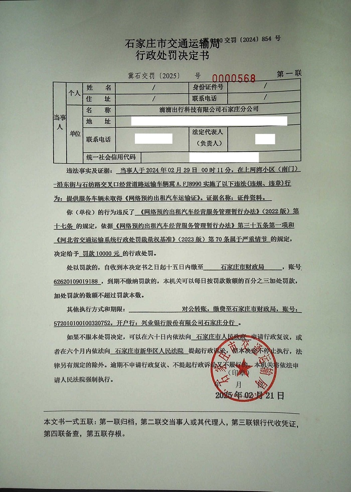 滴滴出行科技有限公司石家庄分公司提供服务车辆(冀A.FJ8990)未取得《网络预约出租汽车运输证》(冀石交罚〔2025〕0000568 号)