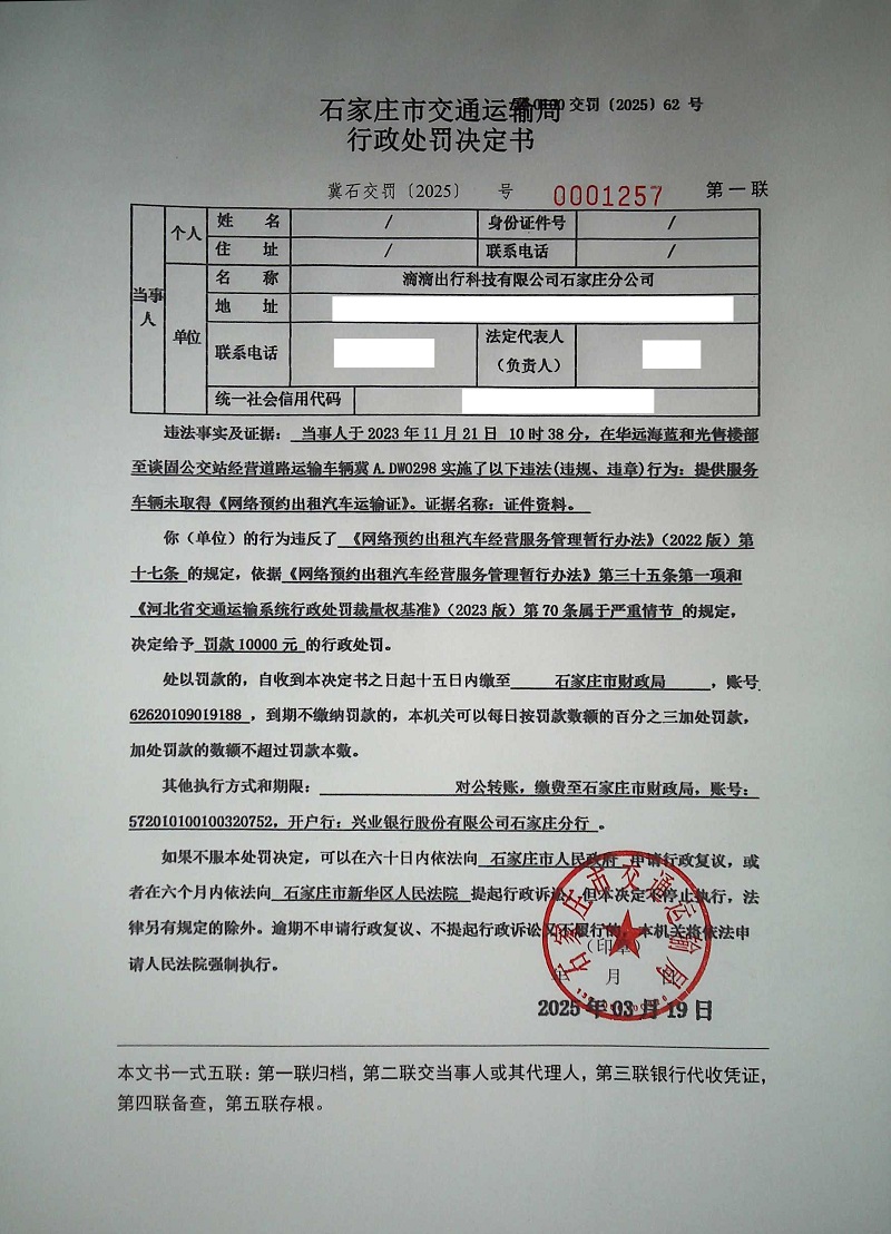 滴滴出行科技有限公司石家庄分公司提供服务车辆(冀A.DW0298)未取得《网络预约出租汽车运输证》(冀石交罚〔2025〕0001257 号)
