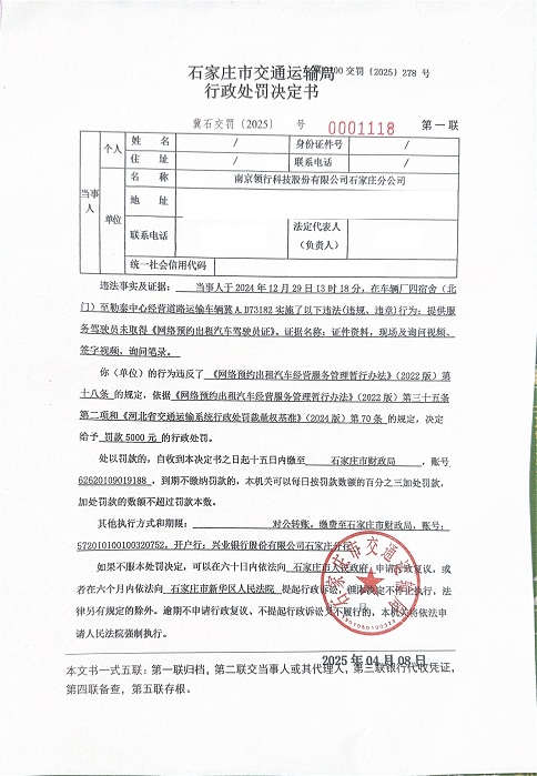 南京领行科技股份有限公司石家庄分公司冀A.D73182提供服务驾驶员未取得《网络预约出租汽车驾驶员证》冀石交罚〔2025〕0001118 号
