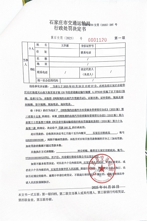 王步新驾驶的冀 A.DP9648未取得《网络预约出租汽车驾驶员证》冀石交罚〔2025〕0001120 号