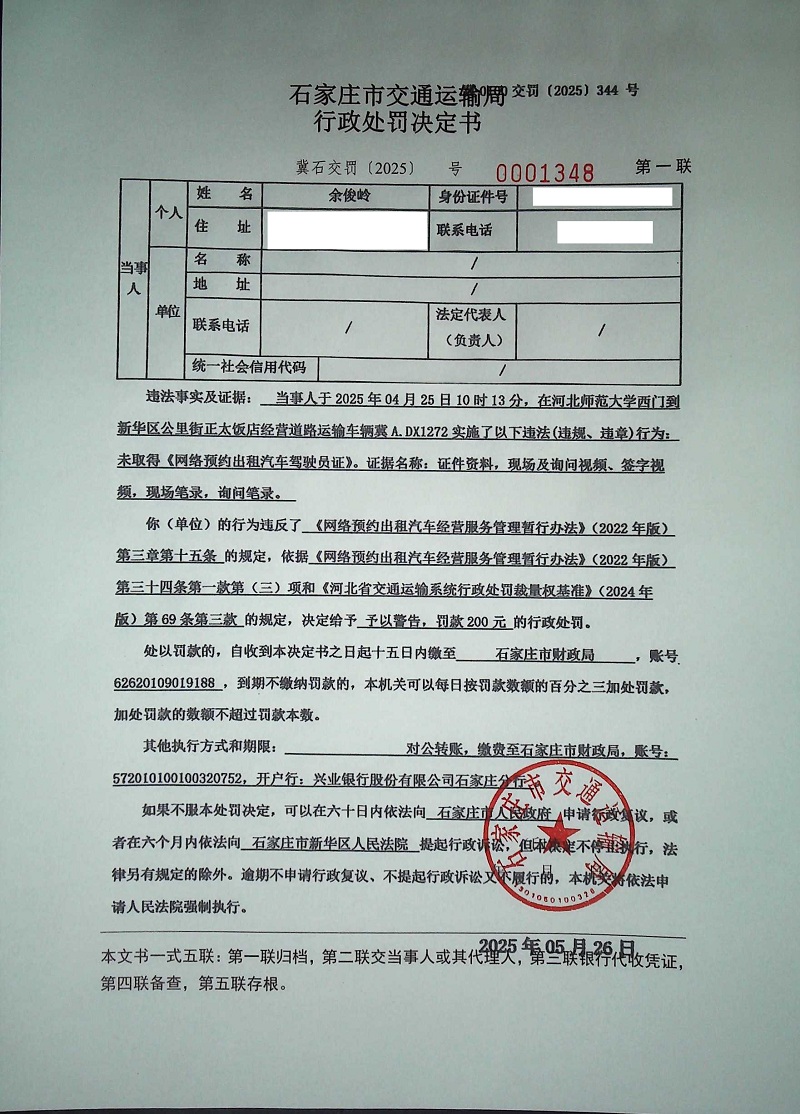 余俊岭驾驶冀A.DX1272未取得《网络预约出租汽车驾驶员证》(冀石交罚〔2025〕0001348号)