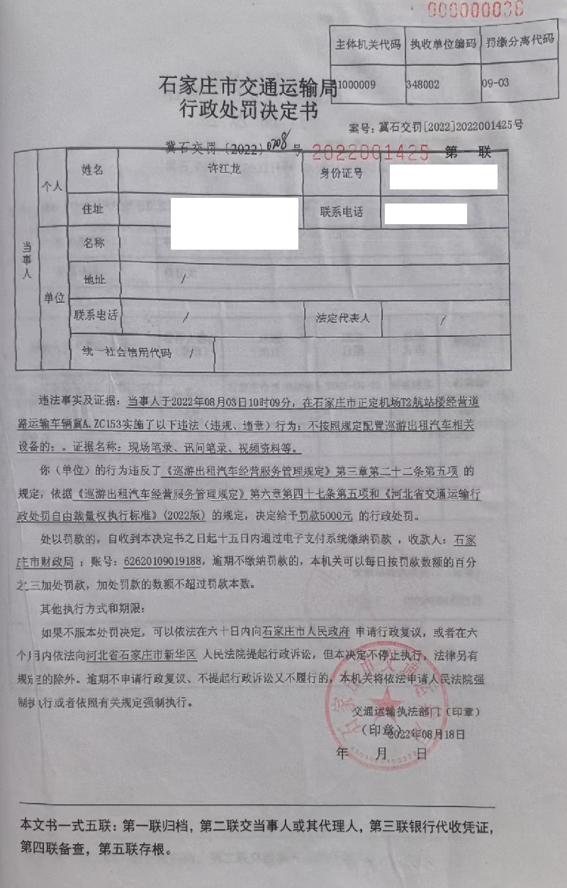 许江龙驾驶冀A.ZC153不按照规定配置巡游出租汽车相关设备的(冀石交罚[2022]2022001425号)
