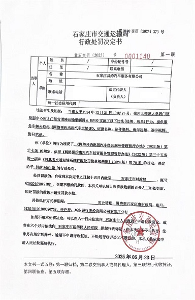 石家庄易约汽车服务有限公司冀A.1E0U0提供服务车辆未取得《网络预约出租汽车运输证》 冀石交罚〔2025〕0001140 号