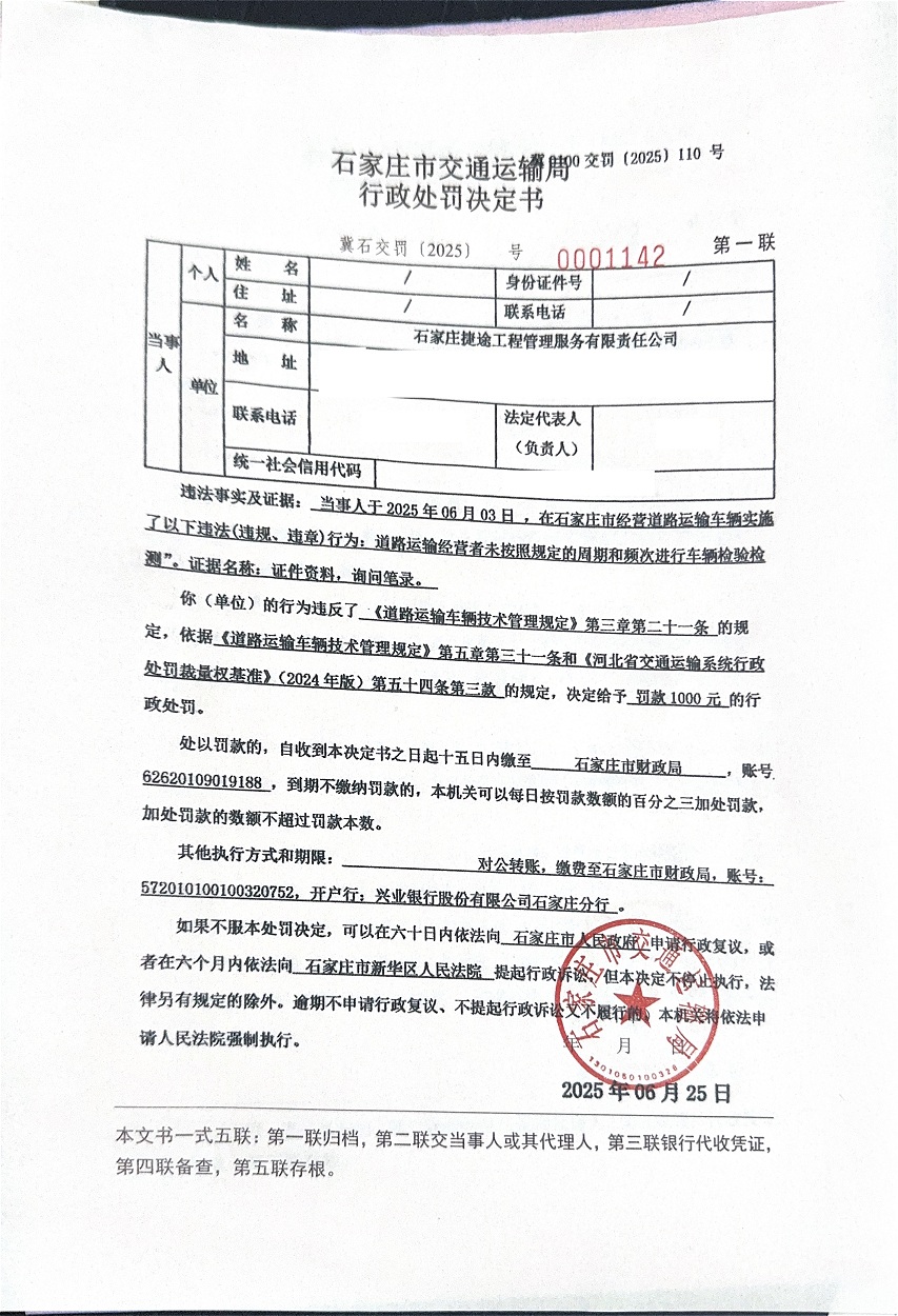 石家庄捷途工程管理服务有限责任公司道路运输经营者未按照规定的周期和频次进行车辆检验检测冀石交罚〔2025〕0001142 号