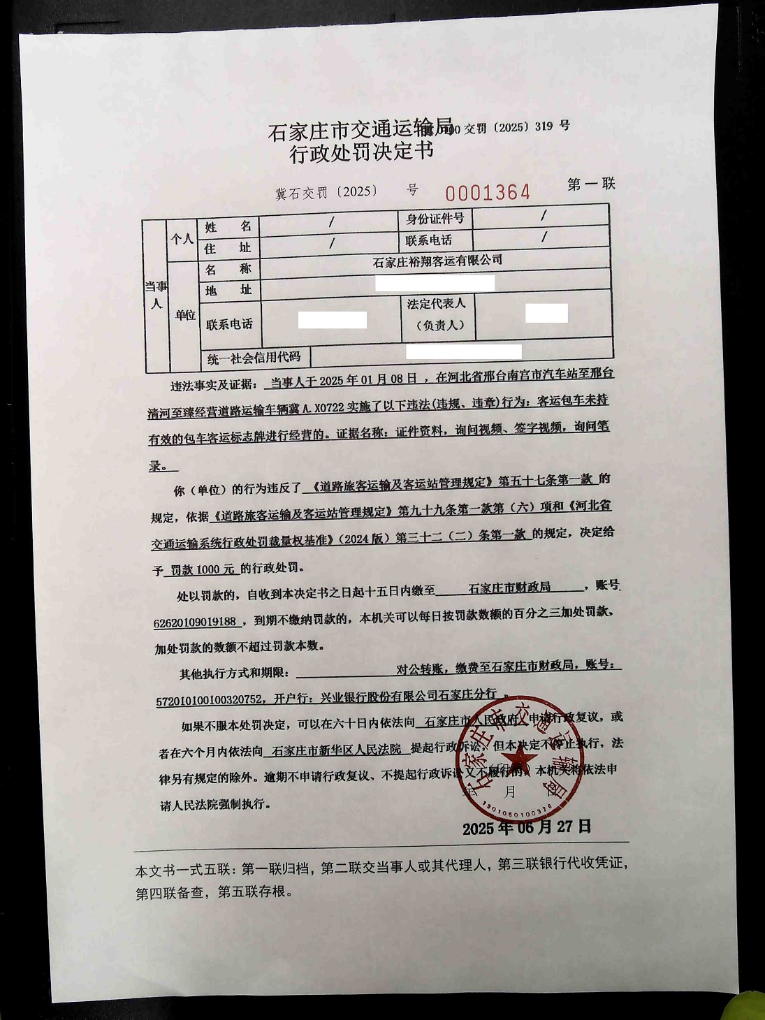 石家庄裕翔客运有限公司冀A.X0722客运包车未持有效的包车客运标志牌进行经营(冀石交罚〔2025〕0001364 号)