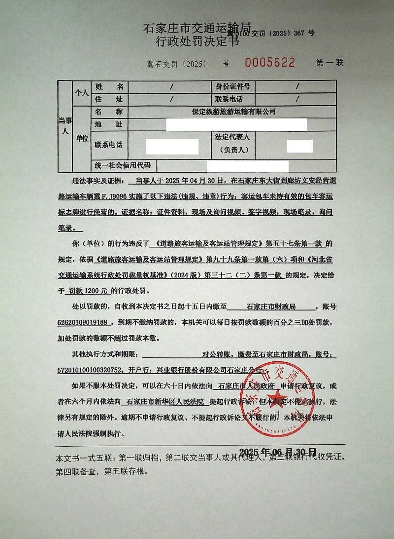 保定纵游旅游运输有限公司冀F.J9096客运包车未持有效的包车客运标志牌进行经营(冀石交罚〔2025〕0005622 号)