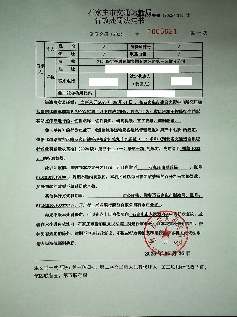 河北保定交通运输集团有限公司第三运输分公司冀F.F3002客运班车不按照批准的配客站点停靠运行(冀石交罚〔2025〕0005621 号)