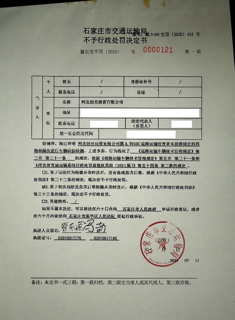 河北创贝商贸有限公司冀A.701DS道路运输经营者未按照规定的周期和频次进行车辆检验检测(冀石交不罚〔2025〕0000121 号)