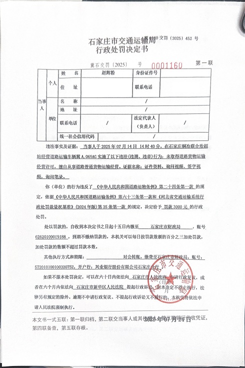 赵辉粉驾驶的冀A.065AG未取得道路货物运输经营许可,擅自从事道路普通货物运输经营冀石交罚〔2025〕0001160 号