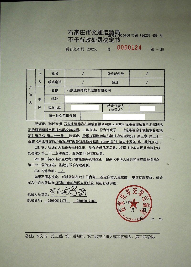 石家庄卿泽汽车运输有限公司冀A.X6039道路运输经营者未按照规定的周期和频次进行车辆检验检测(冀石交不罚〔2025〕0000124 号)
