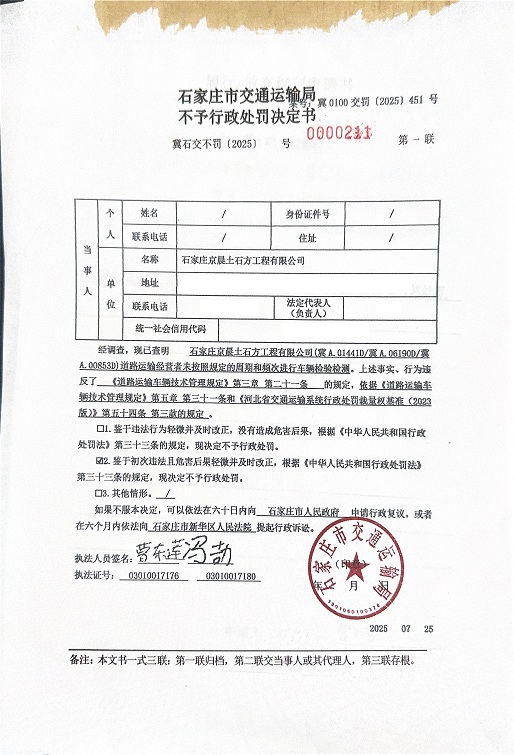 石家庄京晨土石方工程有限公司冀A.01441D冀A.06190D冀A.00853D道路运输经营者未按照规定的周期和频次进行车辆检验检测 冀石交不罚〔2025〕0000211 号