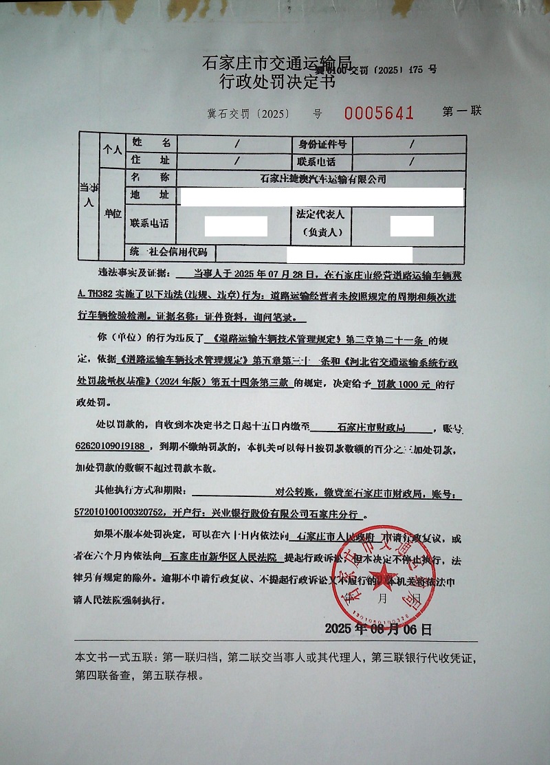 石家庄捷澳汽车运输有限公司冀A.TH382道路运输经营者未按照规定的周期和频次进行车辆检验检测(冀石交罚〔2025〕0005641 号)
