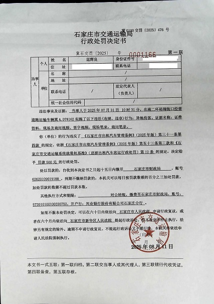屈辉良驾驶的冀A.D78162异地待客冀石交罚〔2025〕0001166 号