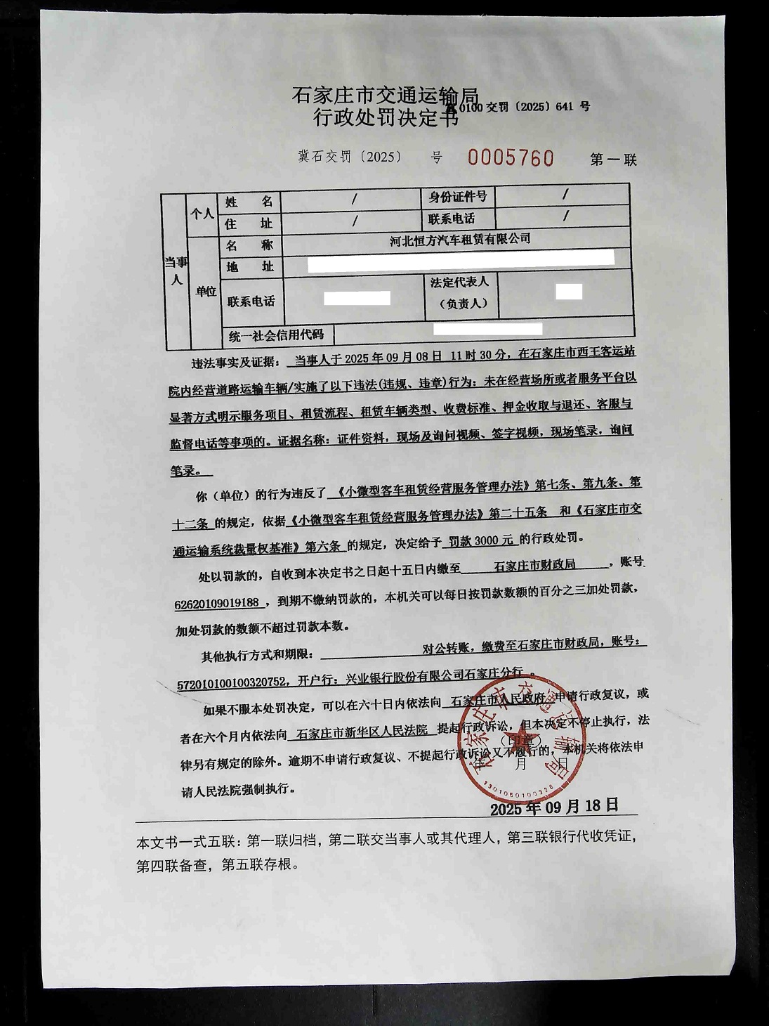 河北恒方汽车租赁有限公司未在经营场所或者服务平台以显著方式明示服务项目、租赁流程、租赁车辆类型、收费标准、押金收取与退还、客服与监督电话等事项的(冀石交罚〔2025〕0005760 号)
