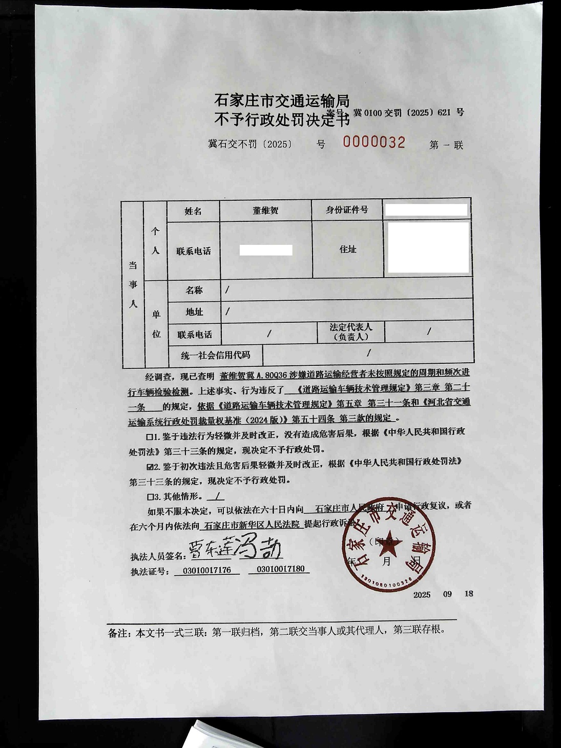 董维贺冀A.80Q36道路运输经营者未按照规定的周期和频次进行车辆检验检测( 冀石交不罚〔2025〕0000032 号)