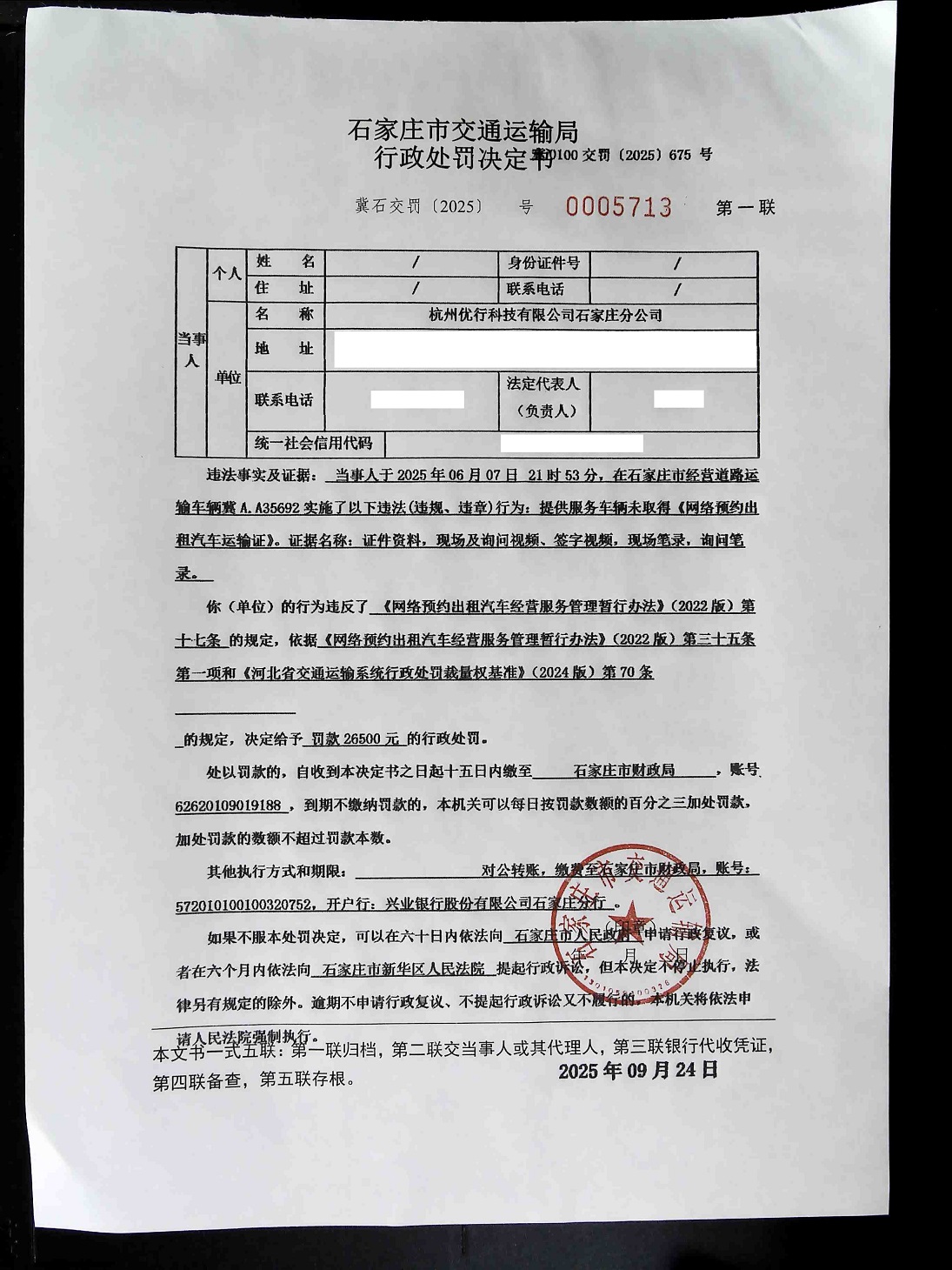 杭州优行科技有限公司石家庄分公司提供服务车辆冀A.A35692未取得《网络预约出租汽车运输证》(冀石交罚〔2025〕0005713 号)