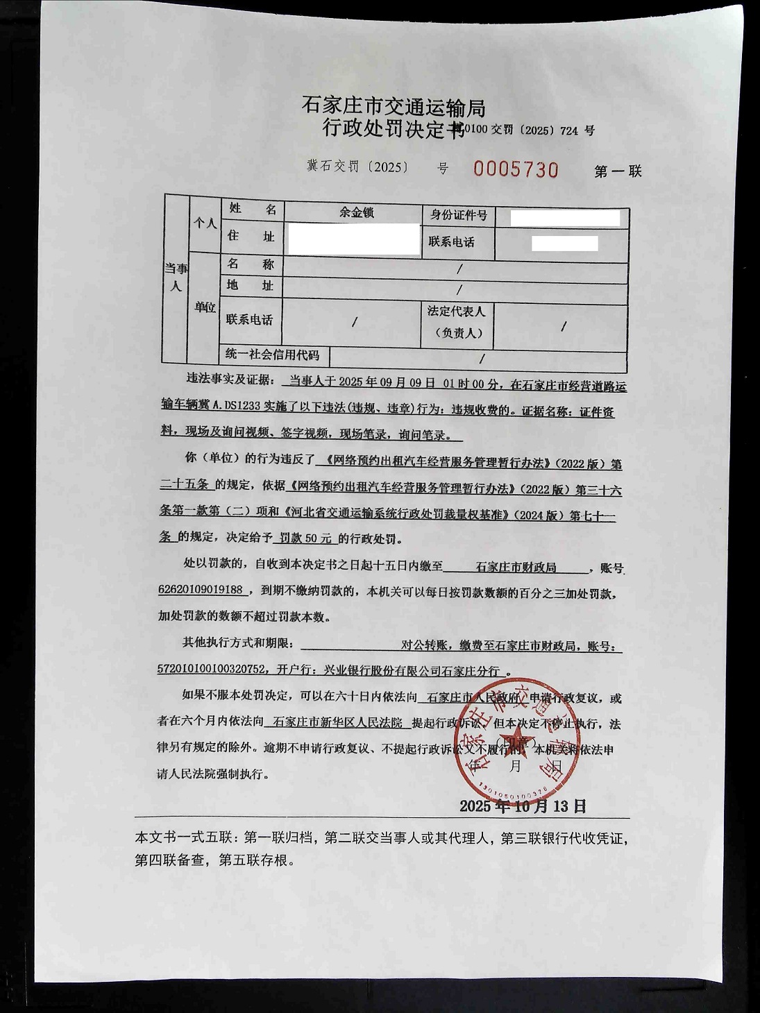 余金锁驾驶冀A.DS1233号车违规收费的(冀石交罚〔2025〕0005730 号)