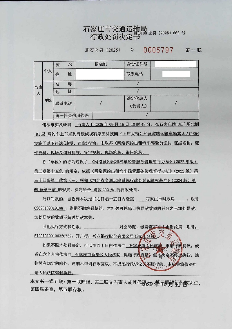杨晓旭驾驶冀A.A74664未取得《网络预约出租汽车驾驶员证》(冀石交罚〔2025〕0005797 号)