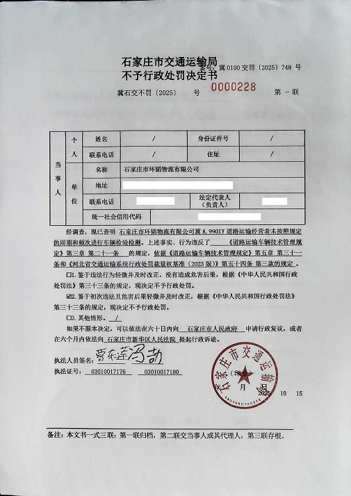 石家庄市环韬物流有限公司冀A.9901Y道路运输经营者未按照规定的周期和频次进行车辆检验检测冀石交不罚〔2025〕0000228 号