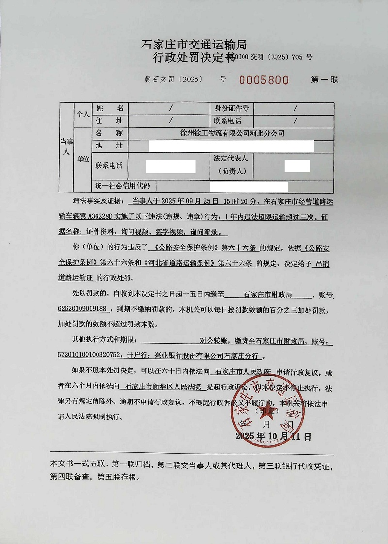 徐州徐工物流有限公司河北分公司所属车辆冀A.36228D 1年内违法超限运输超过三次(冀石交罚〔2025〕0005800 号)