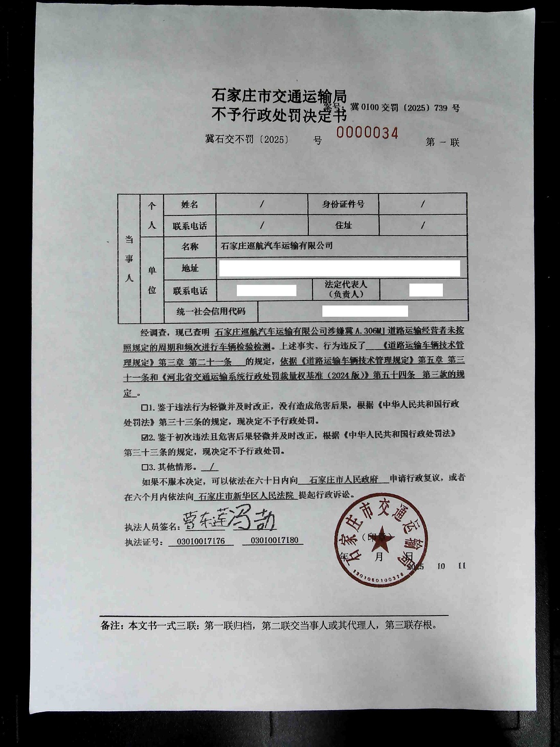 石家庄巡航汽车运输有限公司冀A.306MJ道路运输经营者未按照规定的周期和频次进行车辆检验检测(冀石交不罚〔2025〕0000034 号)