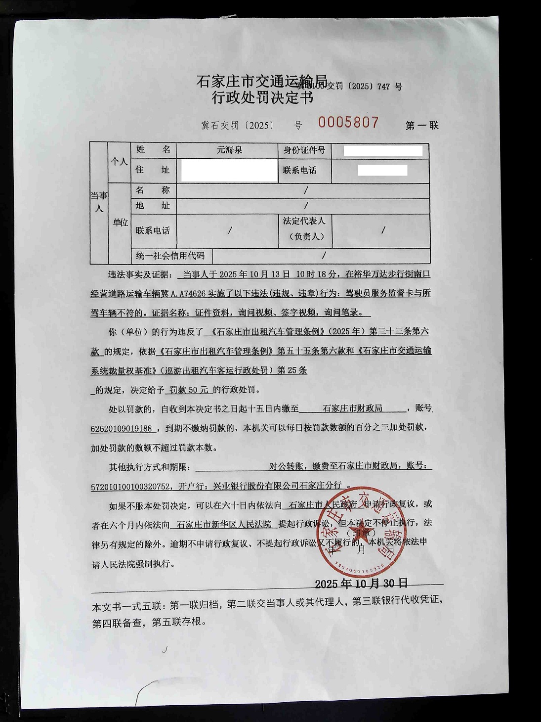 元海泉驾驶冀A.A74626号出租汽车驾驶员服务监督卡与所驾车辆不符的(冀石交罚〔2025〕0005807 号)