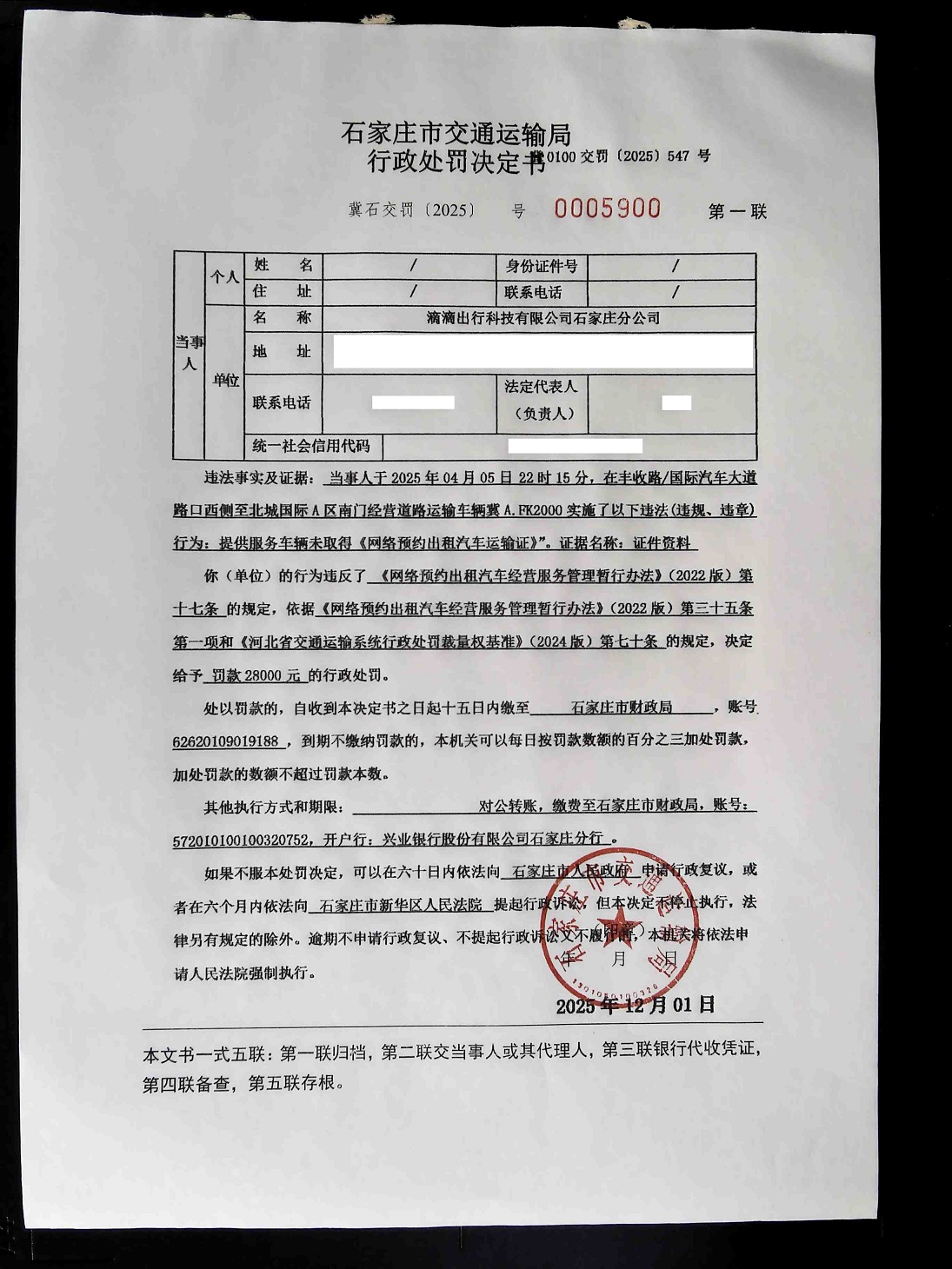 滴滴出行科技有限公司石家庄分公司提供服务车辆(冀A.FK2000)未取得《网络预约出租汽车运输证》(冀石交罚〔2025〕0005900 号)