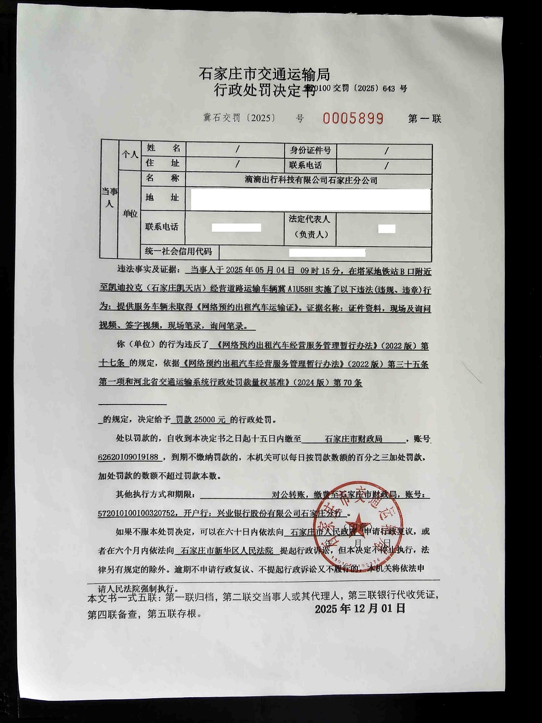 滴滴出行科技有限公司石家庄分公司提供服务车辆冀A1U58H未取得《网络预约出租汽车运输证》(冀石交罚〔2025〕0005899 号)