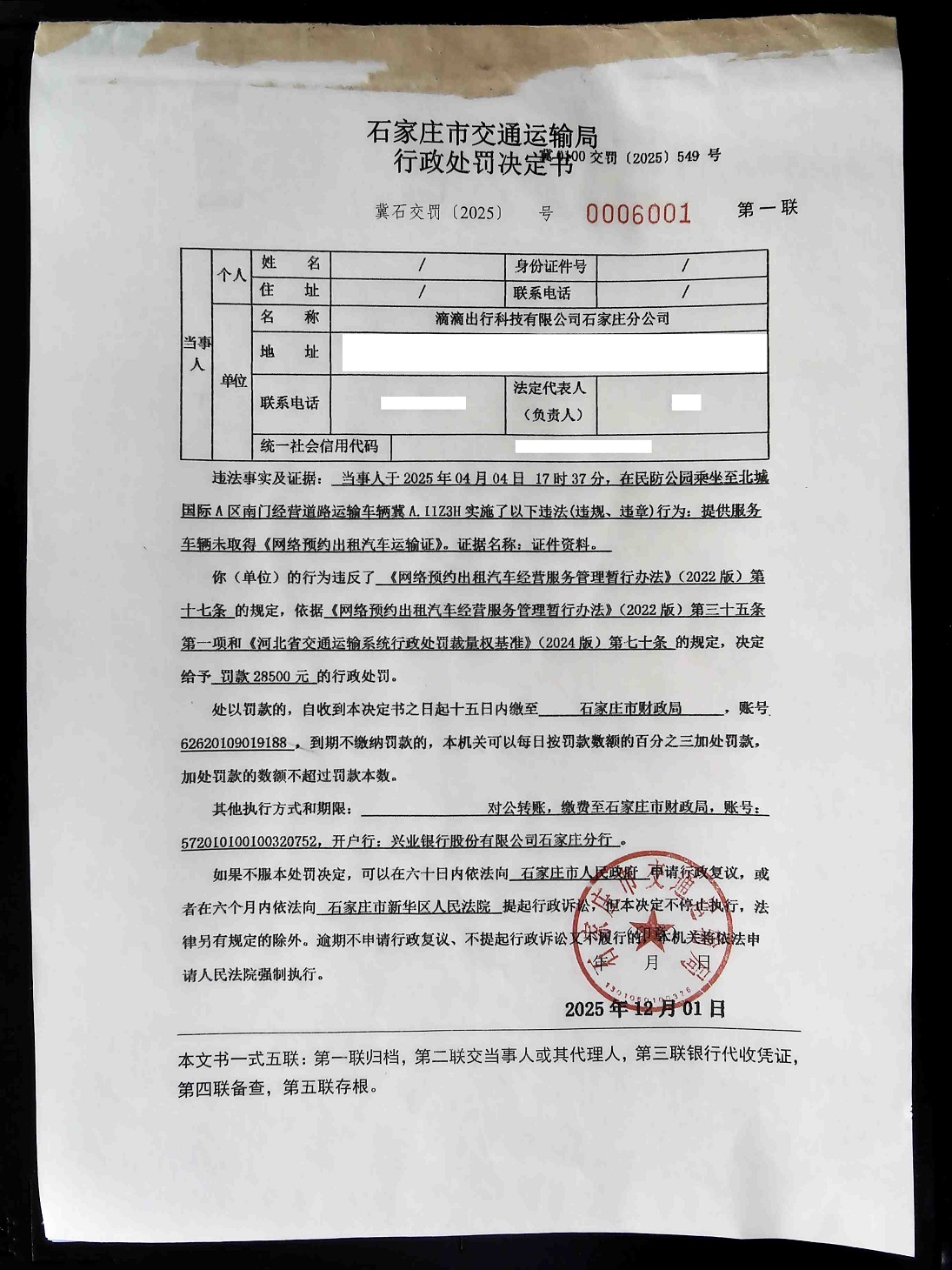 滴滴出行科技有限公司石家庄分公司提供服务车辆(冀A.11Z3H)未取得《网络预约出租汽车运输证》(冀石交罚〔2025〕0006001 号)