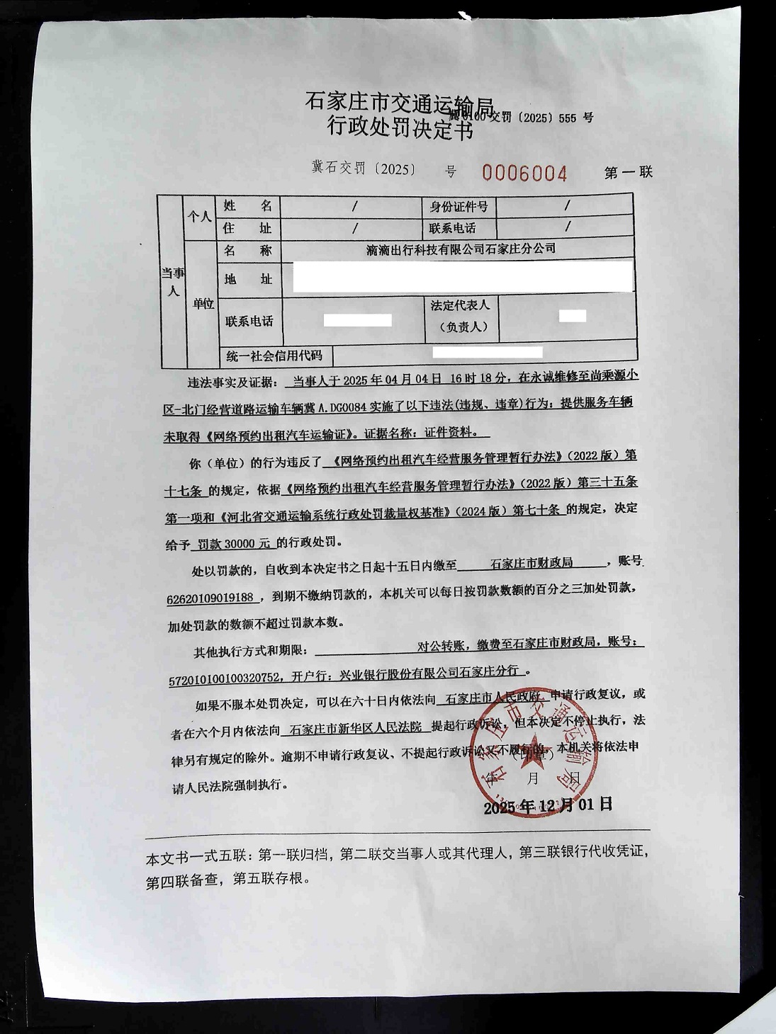 滴滴出行科技有限公司石家庄分公司提供服务车辆(冀A.DG0084)未取得《网络预约出租汽车运输证》(冀石交罚〔2025〕0006004 号)