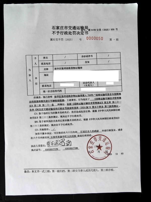 裕华区强利道路货物运输部冀A.789PH道路运输经营者未按照规定的周期和频次进行车辆检验检测(冀石交不罚〔2025〕0000050 号)
