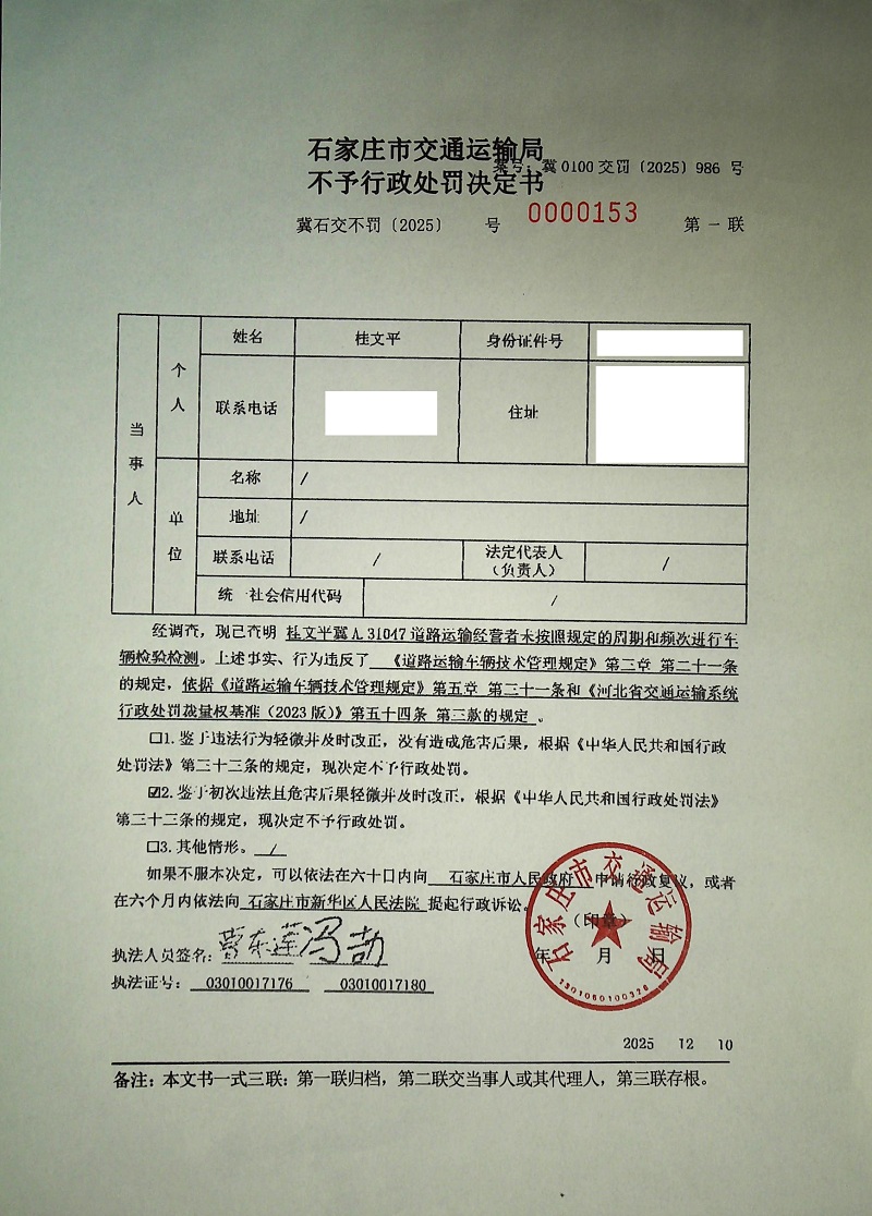 桂文平冀A.31047道路运输经营者未按照规定的周期和频次进行车辆检验检测(冀石交不罚〔2025〕0000153 号)