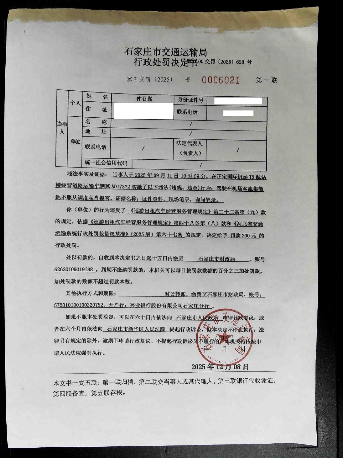 仲召嵩驾驶冀AD17372在机场客流集散地不服从调度私自揽客(冀石交罚〔2025〕0006021 号)