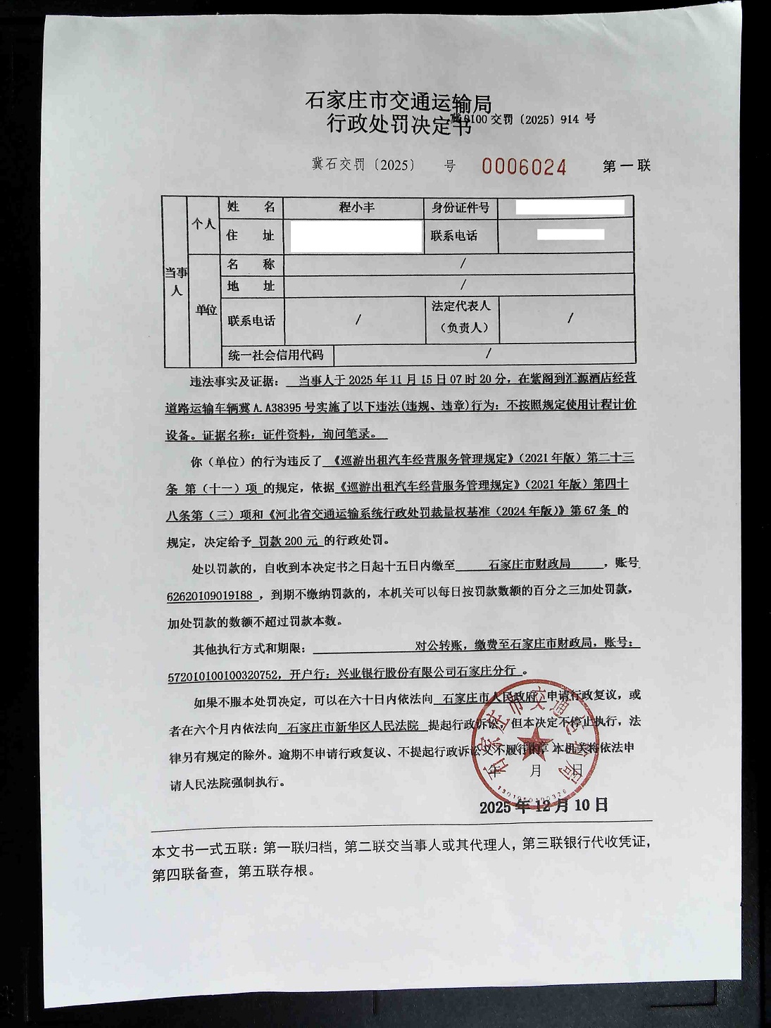 程小丰驾驶冀A.A38395号出租汽车不按照规定使用计程计价设备(冀石交罚〔2025〕0006024 号)