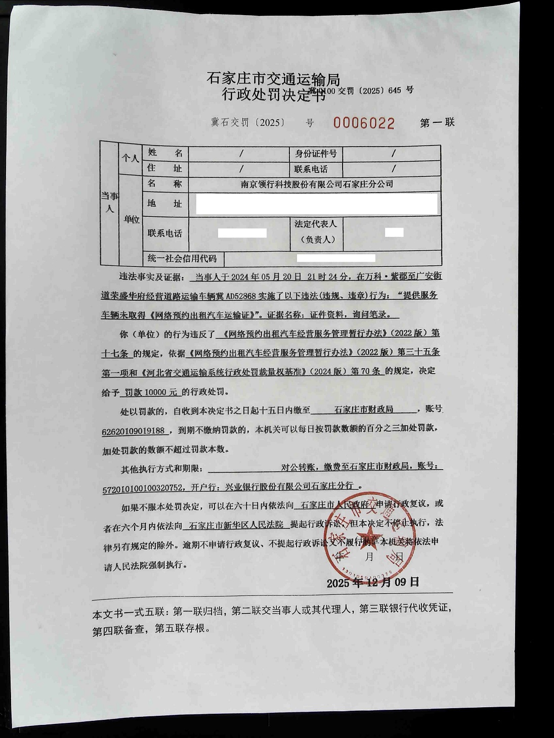 南京领行科技股份有限公司石家庄分公司提供服务车辆(冀AD52868号)未取得《网络预约出租汽车运输证》案(冀石交罚〔2025〕0006022 号)