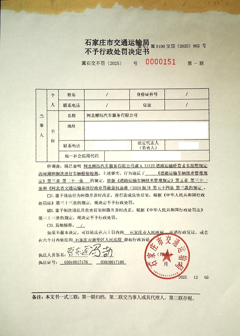 河北顺珏汽车服务有限公司冀A.15122道路运输经营者未按照规定的周期和频次进行车辆检验检测(冀石交不罚〔2025〕0000151 号)
