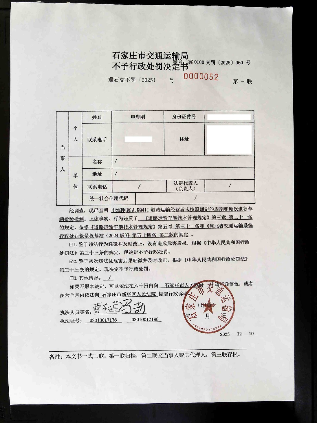 申海刚冀A.KQ411道路运输经营者未按照规定的周期和频次进行车辆检验检测(冀石交不罚〔2025〕0000052 号)