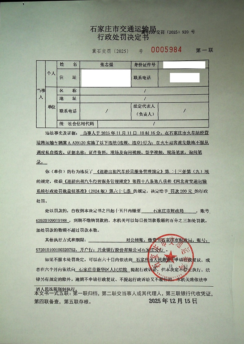 张志强驾驶冀A.A39120在火车站客流集散地不服从调度私自揽客(冀石交罚〔2025〕0005984 号)