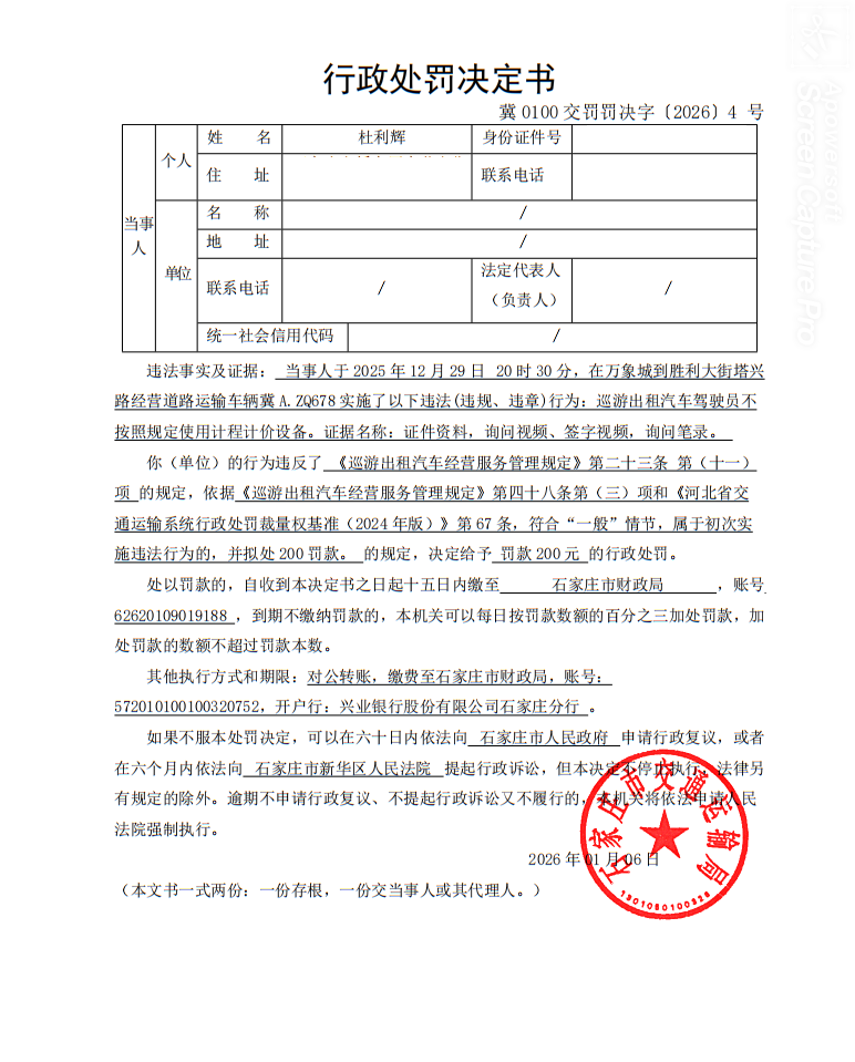 杜利辉驾驶的冀A.ZQ678巡游出租汽车驾驶员不按照规定使用计程计价设备冀0100交罚罚决字〔2026〕4 号