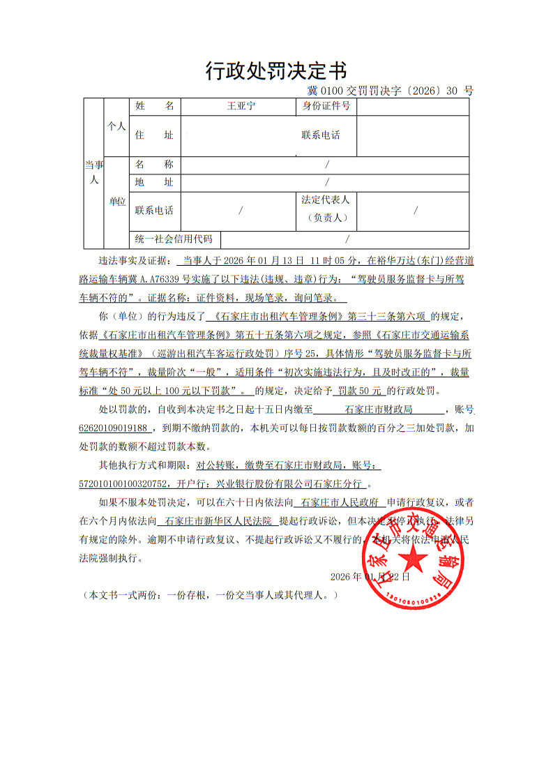 王亚宁驾驶冀A.A76339号出租汽车驾驶员服务监督卡与所驾车辆不符的( 冀0100交罚罚决字〔2026〕30 号)