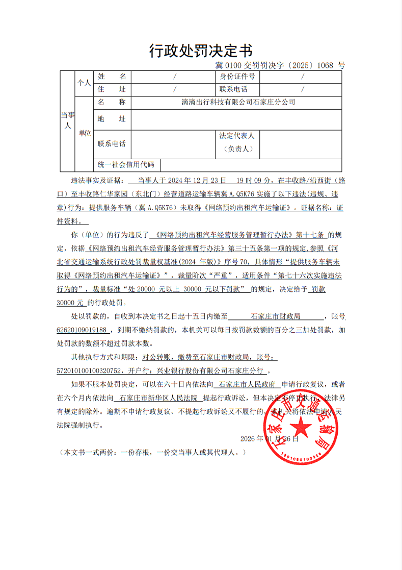 滴滴出行科技有限公司石家庄分公司提供服务车辆(冀A.Q5K76)未取得《网络预约出租汽车运输证》(冀0100交罚罚决字〔2025〕1068 号)