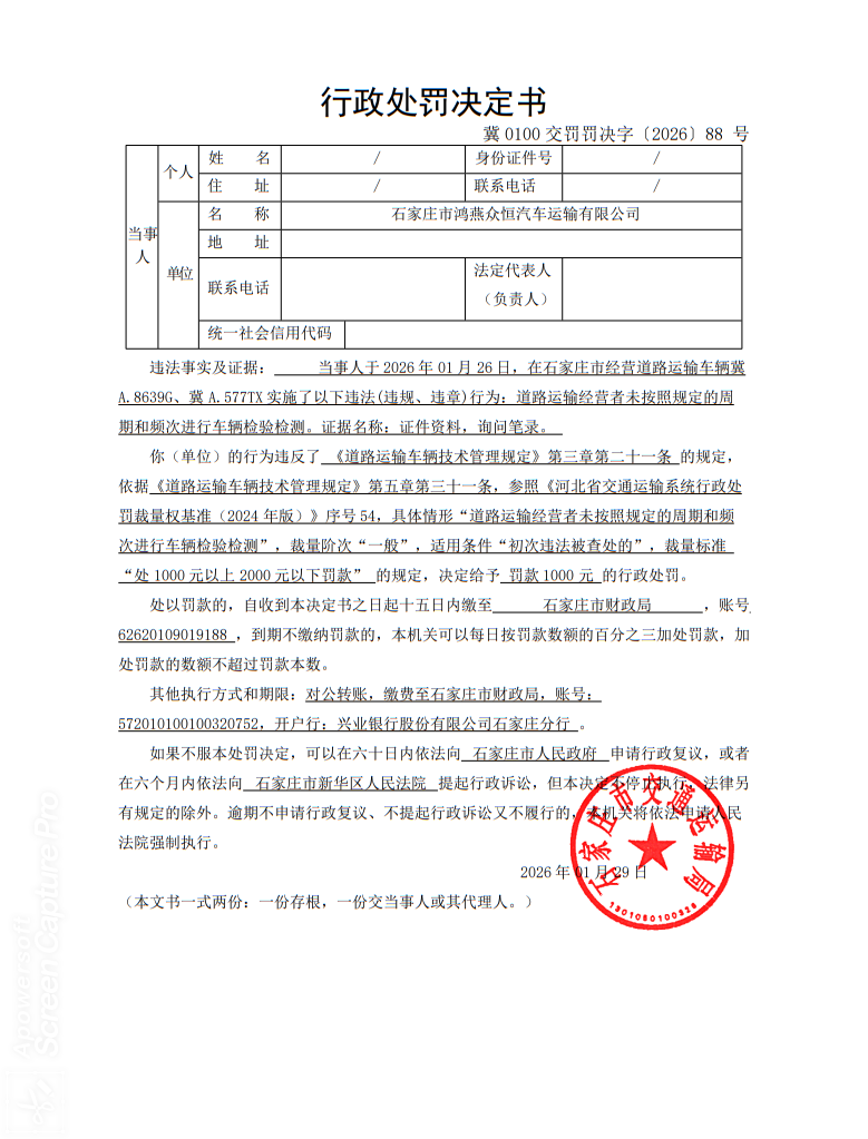 石家庄市鸿燕众恒汽车运输有限公司冀A.8639G、冀A.577TX道路运输经营者未按照规定的周期和频次进行车辆检验检测冀0100交罚罚决字〔2026〕88 号