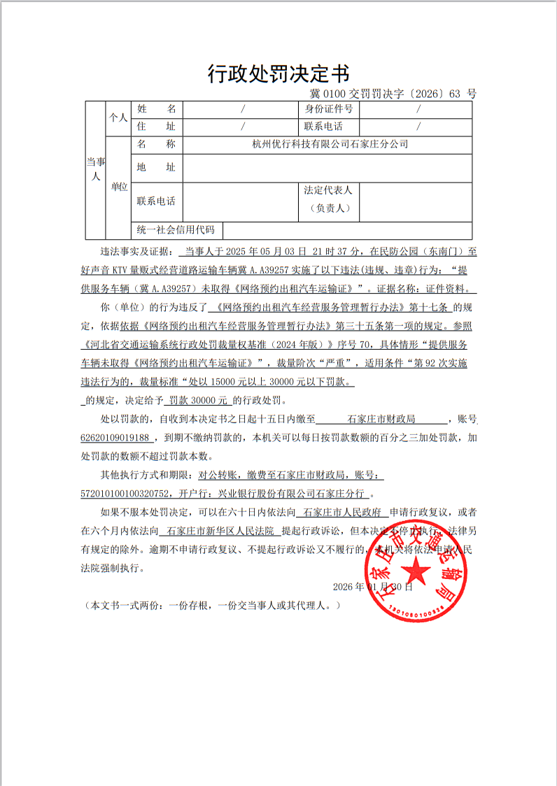 杭州优行科技有限公司石家庄分公司涉提供服务车辆冀A.A39257未取得《网络预约出租汽车运输证》(冀0100交罚罚决字〔2026〕63 号)