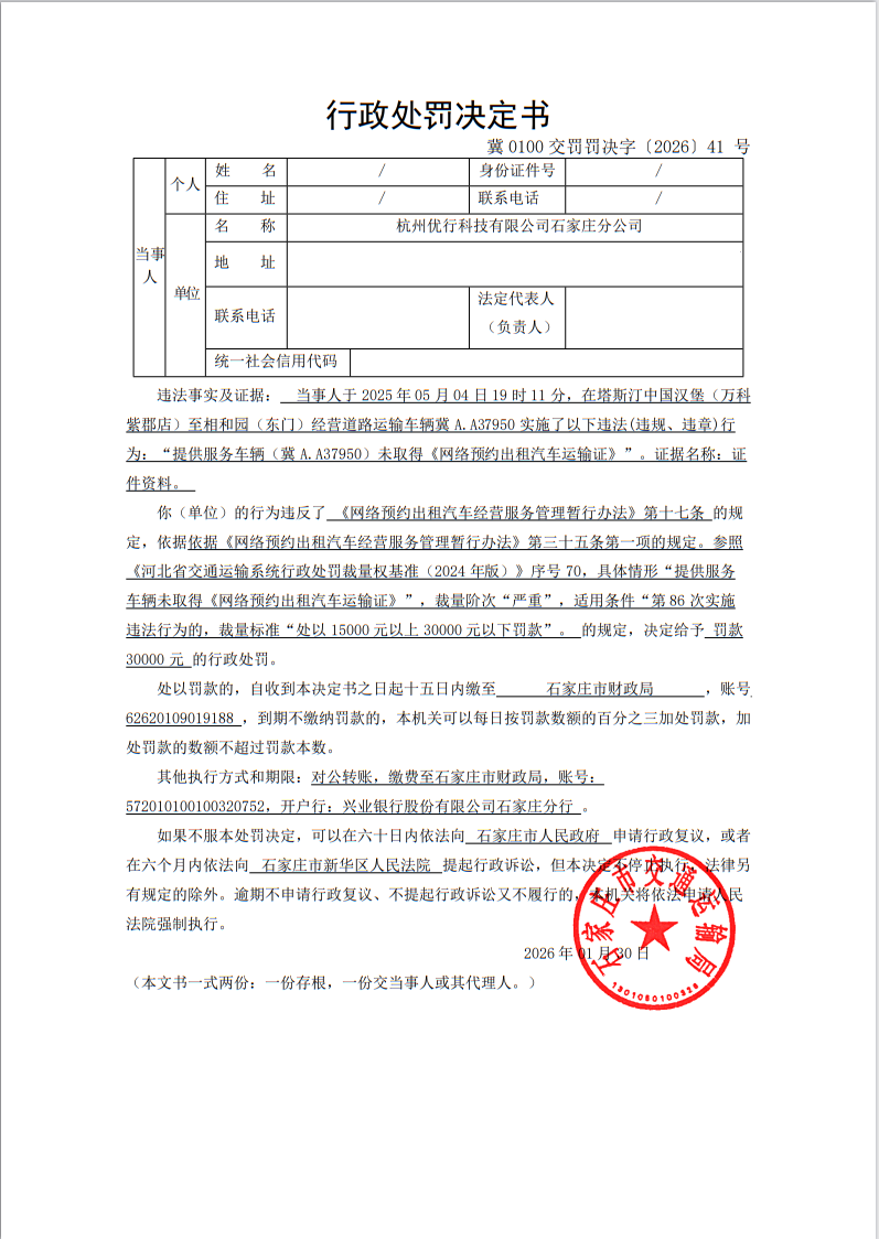 杭州优行科技有限公司石家庄分公司提供服务车辆(冀A.A37950)未取得《网络预约出租汽车运输证》(冀0100交罚罚决字〔2026〕41 号)