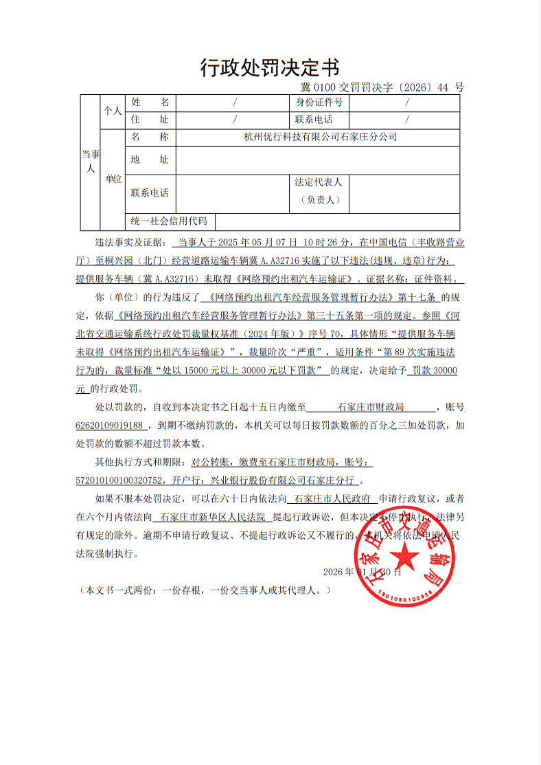 杭州优行科技有限公司石家庄分公司提供服务车辆(冀A.A32716)未取得《网络预约出租汽车运输证》(冀0100交罚罚决字〔2026〕44 号)