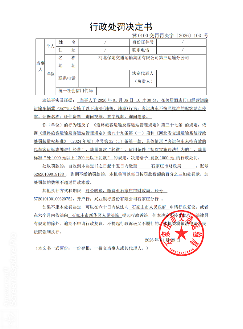 河北保定交通运输集团有限公司第三运输分公司冀F05775D客运班车不按照批准的配客站点停靠冀0100交罚罚决字〔2026〕103
